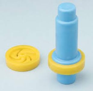 The whole process relies on the wax pattern. When the pattern has long tubes, holes, or vanes in it, like the above picture, a soluble wax (yellow) is required. This wax is leached out off of the pattern wax (blue) leaving the desired shape.
